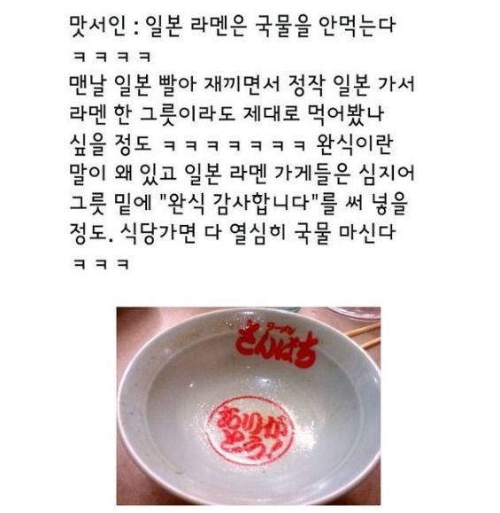 라고 주장하지만 실제로는 일본에서도 국물까지 몽땅 먹으면 완식을 축하하는 멘트가 그릇에 적혀있는 등 국물까지 다 마시는 것을 라멘에 대한 예의라고 생각한다고 한다.