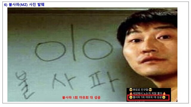 투자업체 관계자인 유모(30)씨 등이 갤러리 대표 A씨를 협박하기 위해 동원한 MZ조폭 ‘불사파’ 일당의 모습. 경찰은 불사파 일당의 소셜네트워크서비스(SNS)에 올라온 사진을 확보해 이들이 주로 1983년생이며 야유회 등 또래 모임을 활발하게 진행하고 있는 것을 확인했다.