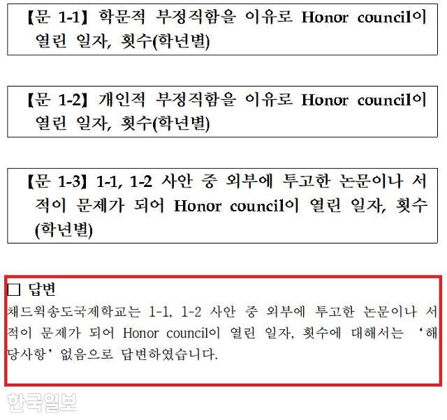 하지만 채드윅 국제학교에선 한 장관 딸에 대해 징계를 하지 않았다. 한국일보가 강민정 더불어민주당 의원실을 통해 입수한 채드윅 국제학교 징계현황에 따르면, 학교 측은 외부에 투고한 논문 등이 문제가 되면서 열린 징계위원회(Honor Council)와 관련해 “해당 사항 없음”이라고 답했다.