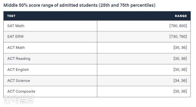 실제로 MIT가 공개한 지난해 입학생들의 ACT 점수는 대부분 만점이거나 만점에 가까웠다. 해외 국적 학생 합격률은 1.4%였고, 한국 국적은 11명으로 대다수는 과학고와 영재고 출신으로 알려졌다. 한 장관 딸은 한국과 미국 이중국적으로, 지난해 시민권자 및 영주권자 합격률은 5.0%였다.