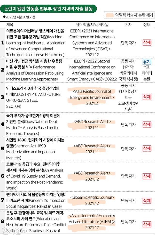 한 장관 딸이 고교 시절 쓴 글 대다수는 학술지에서 삭제됐다. 이날 기준 8편 중 7편이 학술지에서 철회됐다. 삭제된 글들은 '교활한 표절(Sneaky Plagiarism)’ 또는 '대필' 의혹이 제기됐던 논문들이다. 철회되지 않은 논문은 방글라데시의 한 대학 소속 석사생과 함께 작성한 논문으로, 데이터셋(dataset) 무단 인용 의혹이 제기됐다.