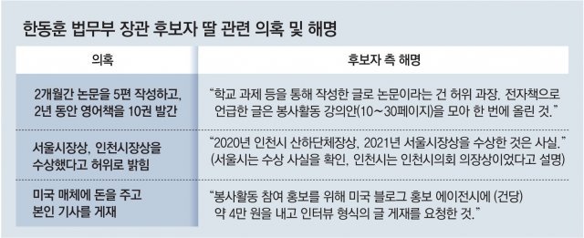 한 장관은 지난해 인사청문회 당시 “(딸이 쓴 글들은) 여러 학습 활동을 저장해놓거나 학교 과제를 아카이브 형식으로 저장해 놓은 것에 불과하다”며 “스펙 쌓기용이 아니며, 입시에 사용할 계획이 없다”고 말했다.