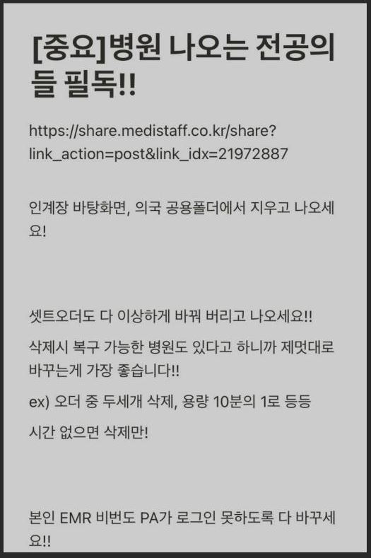 뿐만 아니라 "본인의 전자의무기록 EMR 비밀번호도 로그인 못 하도록 다 바꾸라"고 덧붙였다.