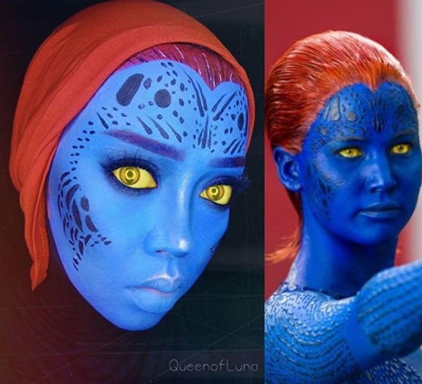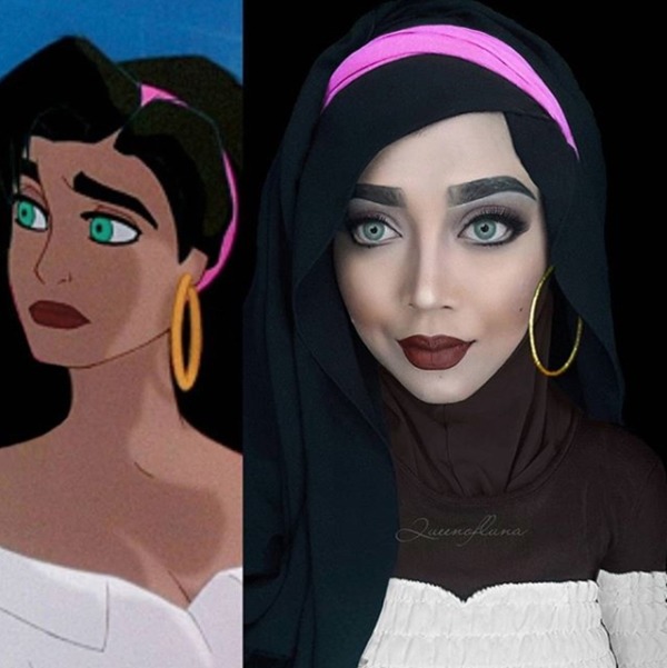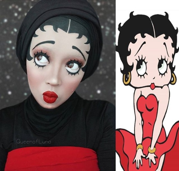 사라스와티는 무슬림 여성들이 착용하는 히잡(Hijab)을 이용해서 메이크업을 선보이고 있는데, 그녀의 작품은 디즈니의 공주 캐릭터부터 베티 붑, 엑스맨에 이르기까지 다양합니다.