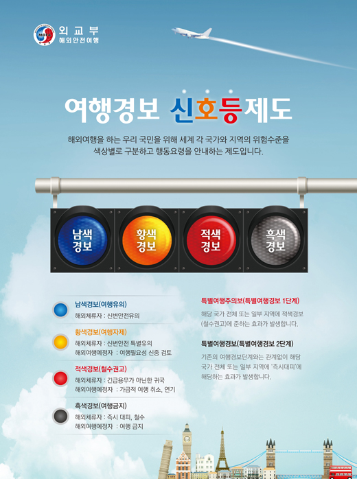 해외여행 시 지금은 피해야 하는 위험한 나라들을 미리 알고 있어야 할 것 같네요. 외교부에서의 권고사항에 해당하는 나라들과 비슷한데, 외교부 사이트에서 더 정확하게 확인해보시면 되겠습니다. (외교부 해외 안전여행국가 신호등제도)