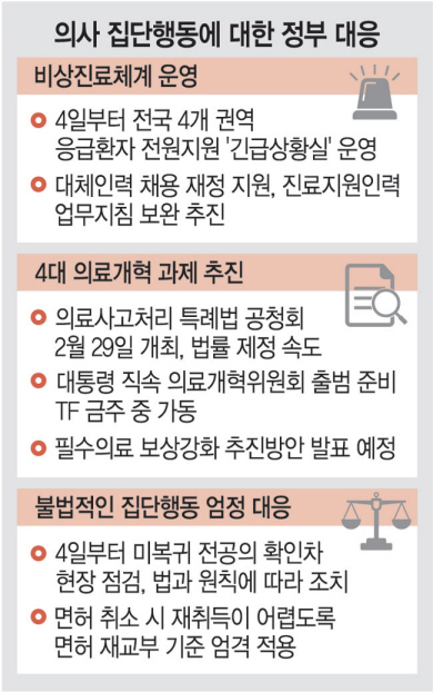 정부는 이날부터 현장을 점검하고, 위반사항에 대해서는 법과 원칙에 따라 행정처분 할 방침이다. 박 차관은 “현실적으로 29일까지 복귀해야만 처분을 면할 수 있지만, 현장 점검을 오늘부터 나가서 현장 확인 전에 복귀가 이뤄졌다면 실질적으로 처분하는 데 상당히 고려될 수 있을 것”이라고 했다.
