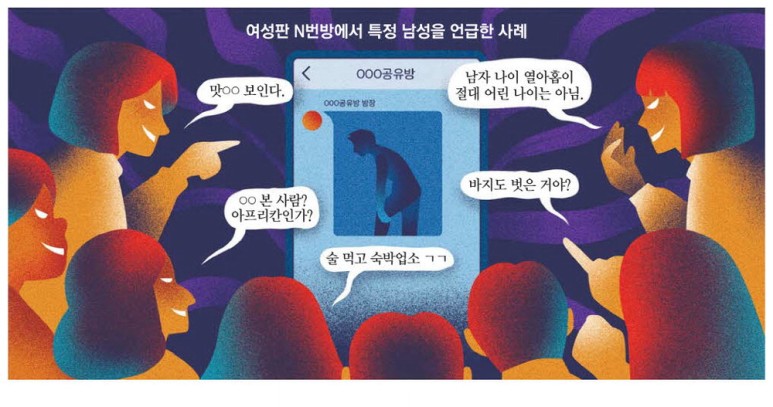 국내최대 여성 커뮤니티 회원이 데이트앱에서 만난 외국남성 개인정보와 불법 촬영물등을 공유하는 일이 자주 일어난다. 예전 n번방 사건과 별 차이가 없을 정도다.