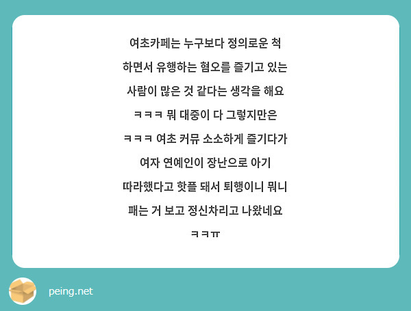 대외적으로는 여성의 상품화를 비판하면서 동시에 자신들은 한국, 외국 남성들의 외모와 신체적 특징을 세세하게 논평하며 정보를 교환하는 행위를 지속한 것이다.