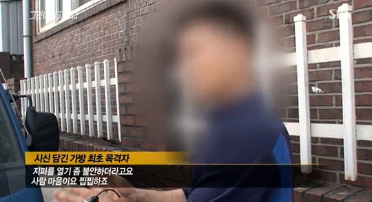 최초 목격자 : 아침에 냄새가 나고, 파리가 좀 끓더라고요. (가방) 바퀴 쪽으로... (중략) 지퍼 열기 불안했죠.