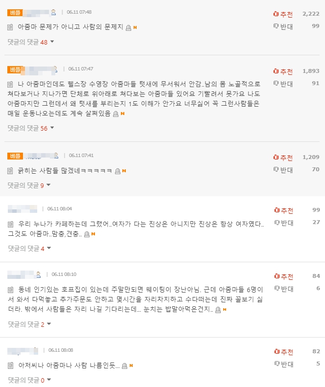 해당 사연이 알려지자 누리꾼들은 "여자가 다 진상은 아니지만 진상은 항상 여자였다", "아줌마 문제가 아니고 사람의 문제지", "나 아줌마인데도 아줌마 텃새에 무서워서 안 감. 남의 몸 노골적으로 쳐다보거나 지나가면 단체로 위아래로 쳐다보는 아줌마들 있어요.