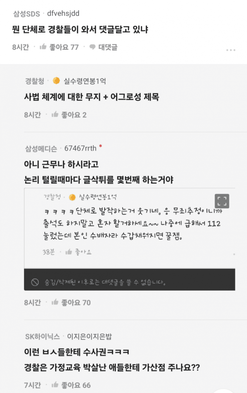 블라인드에서 경찰청의 이름을 달고 많은 경찰들이 댓글을 달고 있었다.