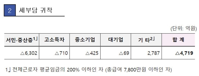 2023년 세법개정안에 담긴 세부담 귀착을 분석한 표. 서민·중산층을 ‘총급여 7800만원 이하인 자’로 정의하고 있다. 기획재정부 ※ 이미지를 누르면 크게 볼 수 있습니다.